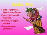Баба-Яга - самый сложный и противоречивый образ в сказочном мире. По самым общим представлениям это Страшная Старуха, с длинным носом и костяной ногой, которая, в основном, лежит на печи в своей избушке на курьих ножках, или носится над Русью на своей ступе, и имеет очень скверный характер. Хотя, если с ней вежливо поговорить, то она может разжалобиться и даже указать путь и дать заветный клубочек, который доведет до места...